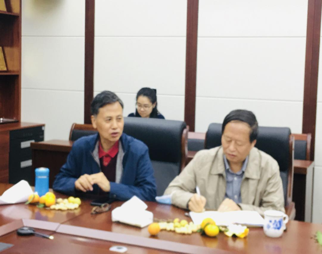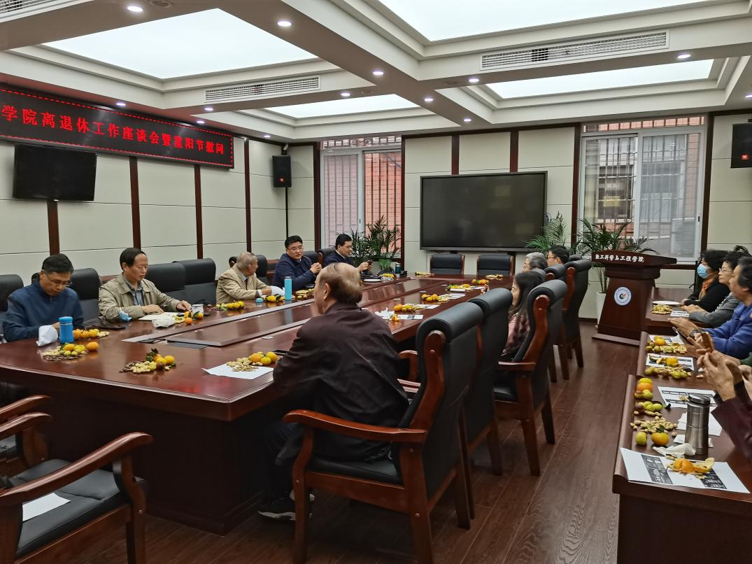 2021�10�14日,�院在纺工附楼205会议室召开离退休教职工座谈暨重阳节慰问会。刘晓虎书记、何有节院长、彭必雨副院长、何强副院长、党政办李慧主任、离退休教职工等参加本次会议。会议由刘晓虎书记主持�