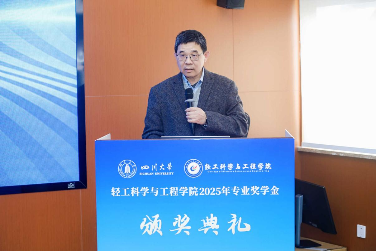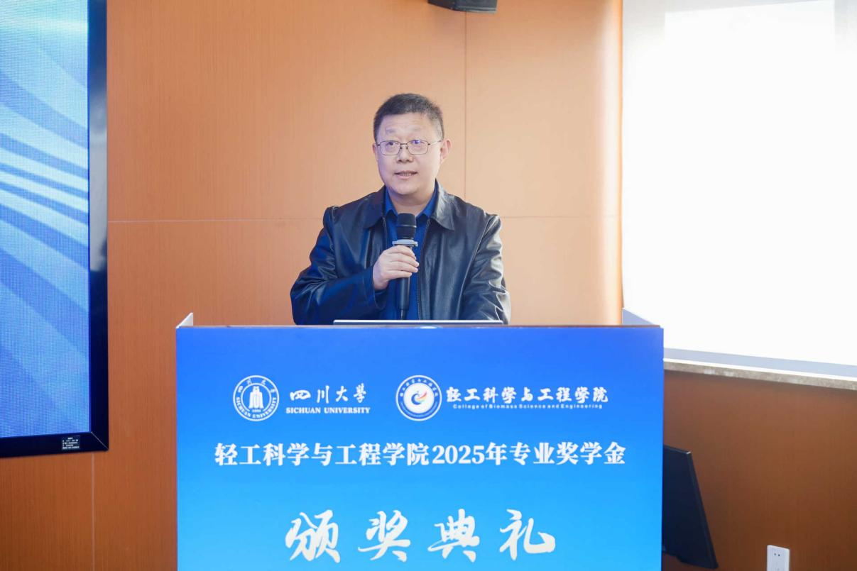 11�28日下午,轻工科学与工程学�2025年专业奖学金颁奖典礼在皮革楼互联网中心举行。中国皮革协会副理事长陈占光、德国司马化学有限公司皮革部中国区总经理张建华、斯塔尔精细涂料有限公司皮革事业部中国区区域销售经理涂刚、天津春发生物科技集团有限公司项目经理董婷等企业嘉宾,学院党委书记李天富、院长彭必雨,副院长周建飞、迟原龙等院领导,生物质与皮革工程系系主任林炜、副系主任程海明,食品工程系系主任吕远平等,与全体获奖师生共同参加典礼。学院党委副书记姜新主持�