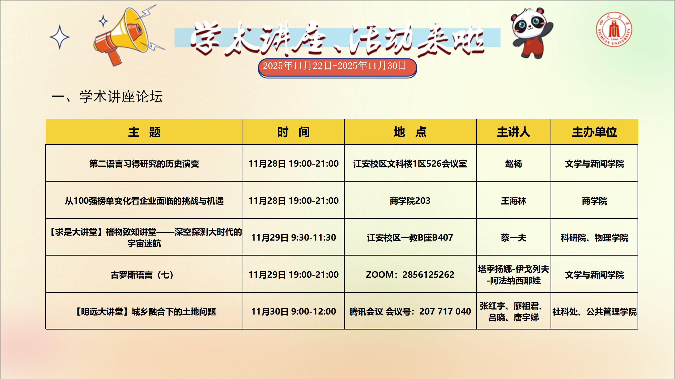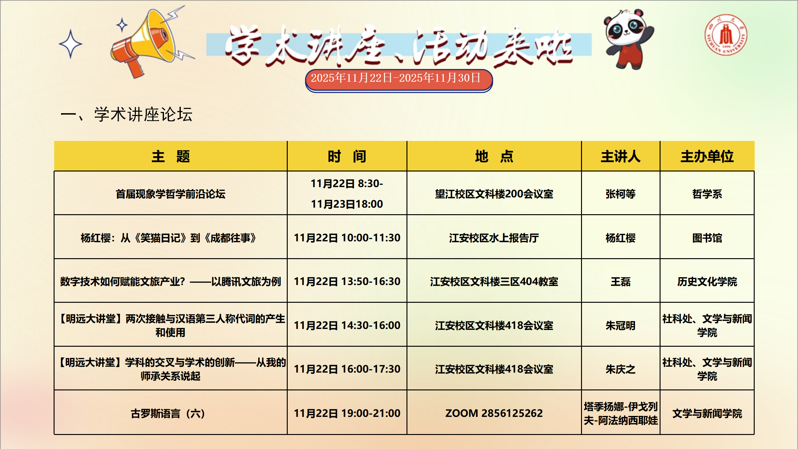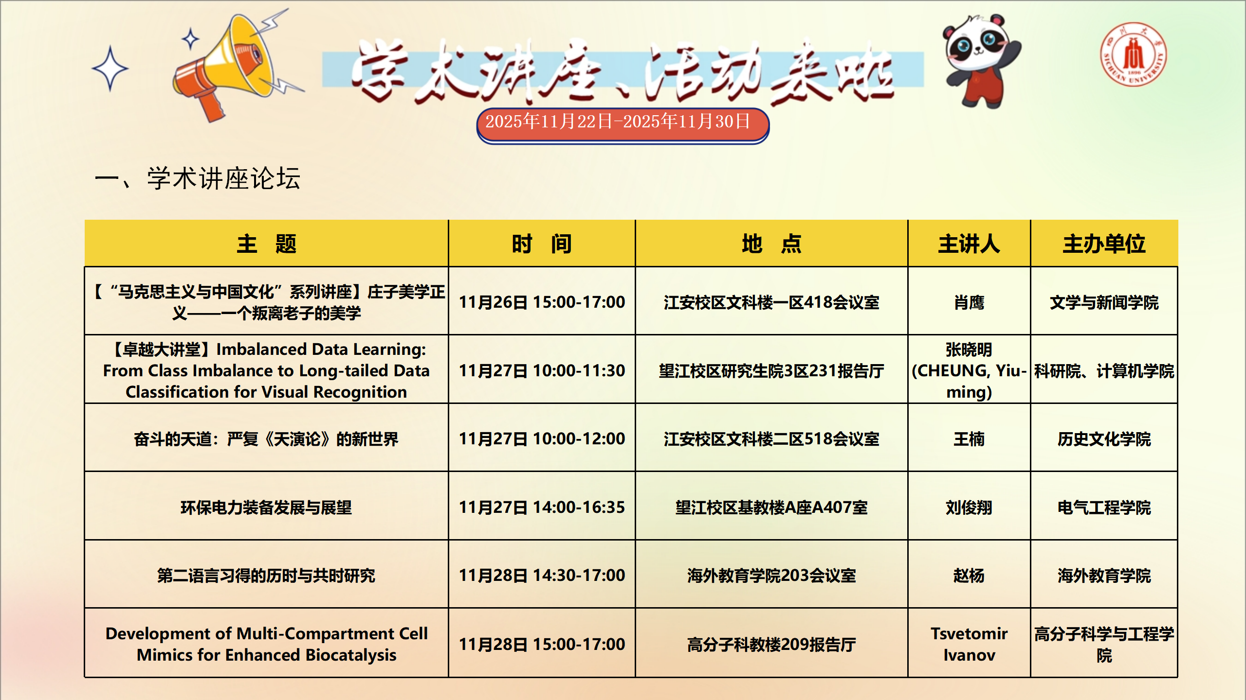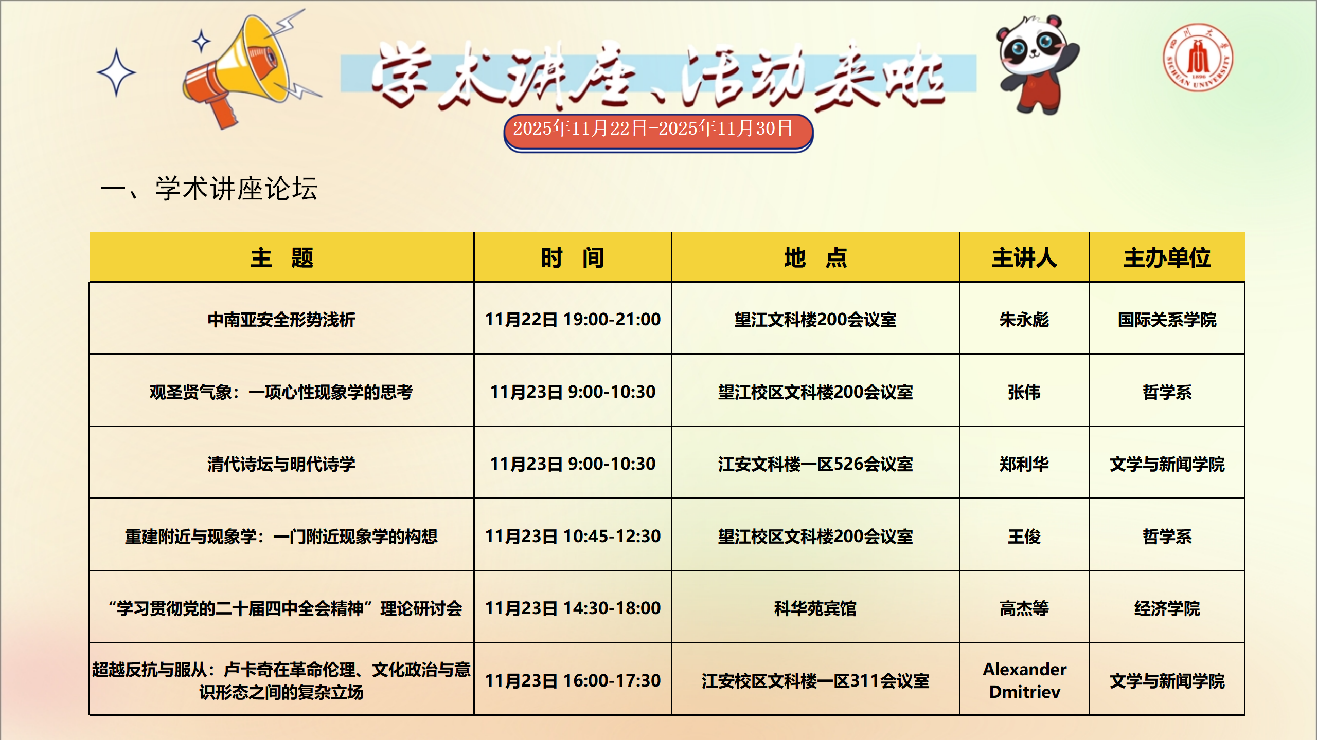 学术讲座和校园文化活动预告(2025年11月22日-2025年11月30日)
