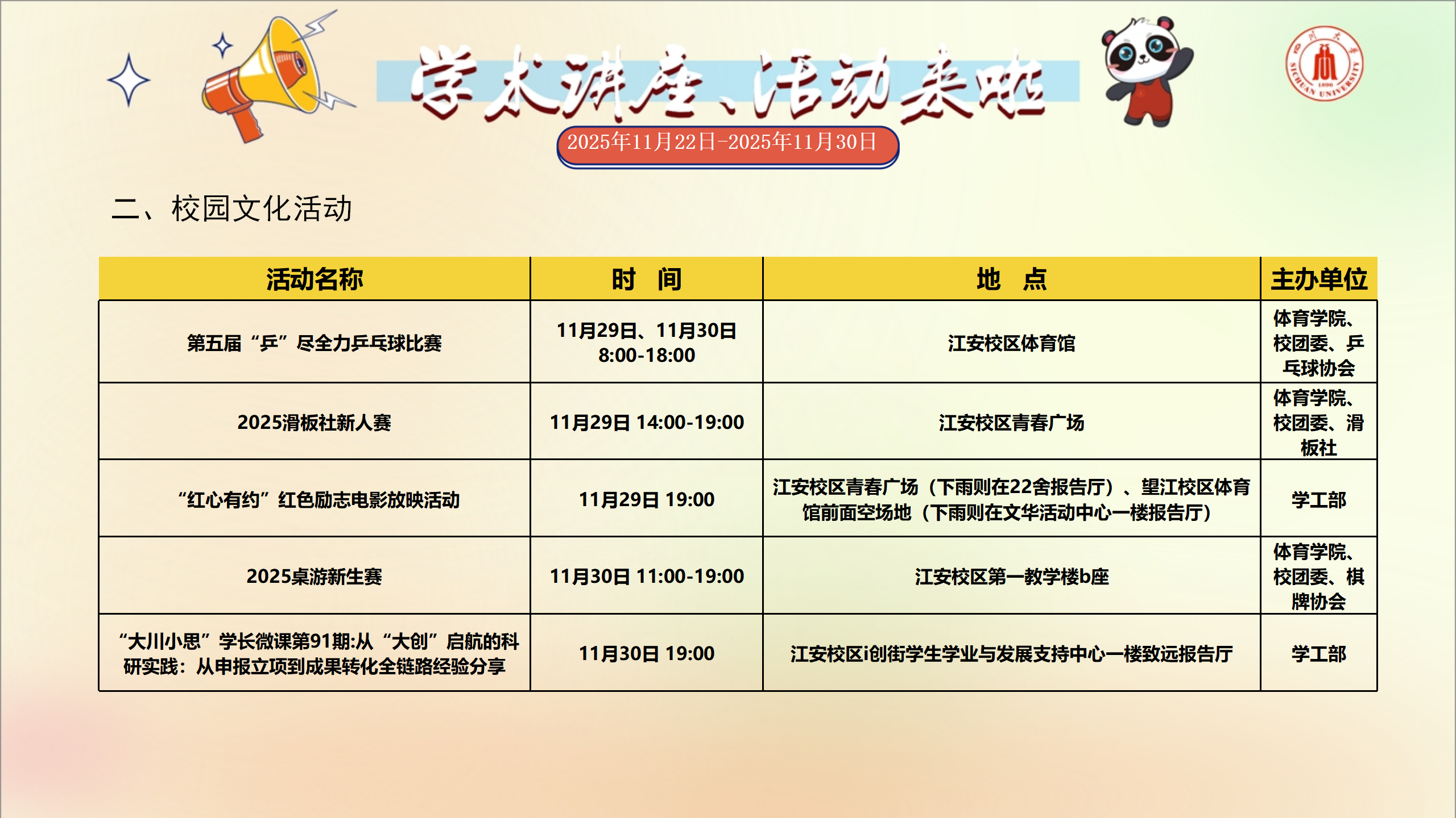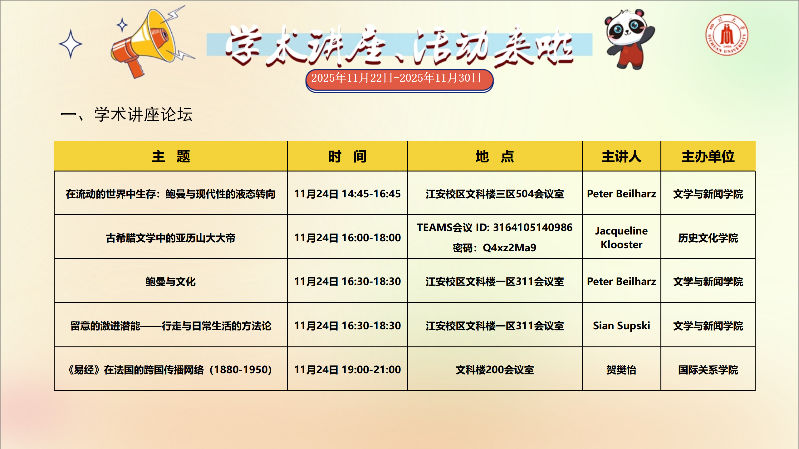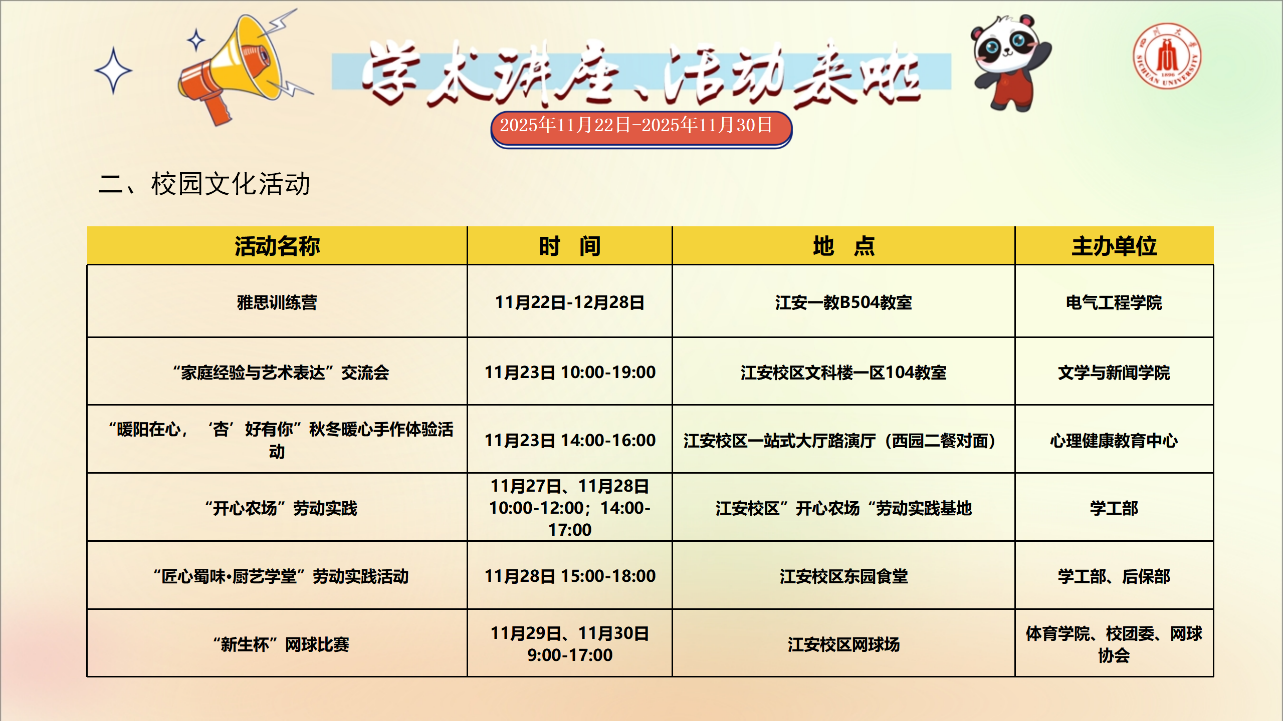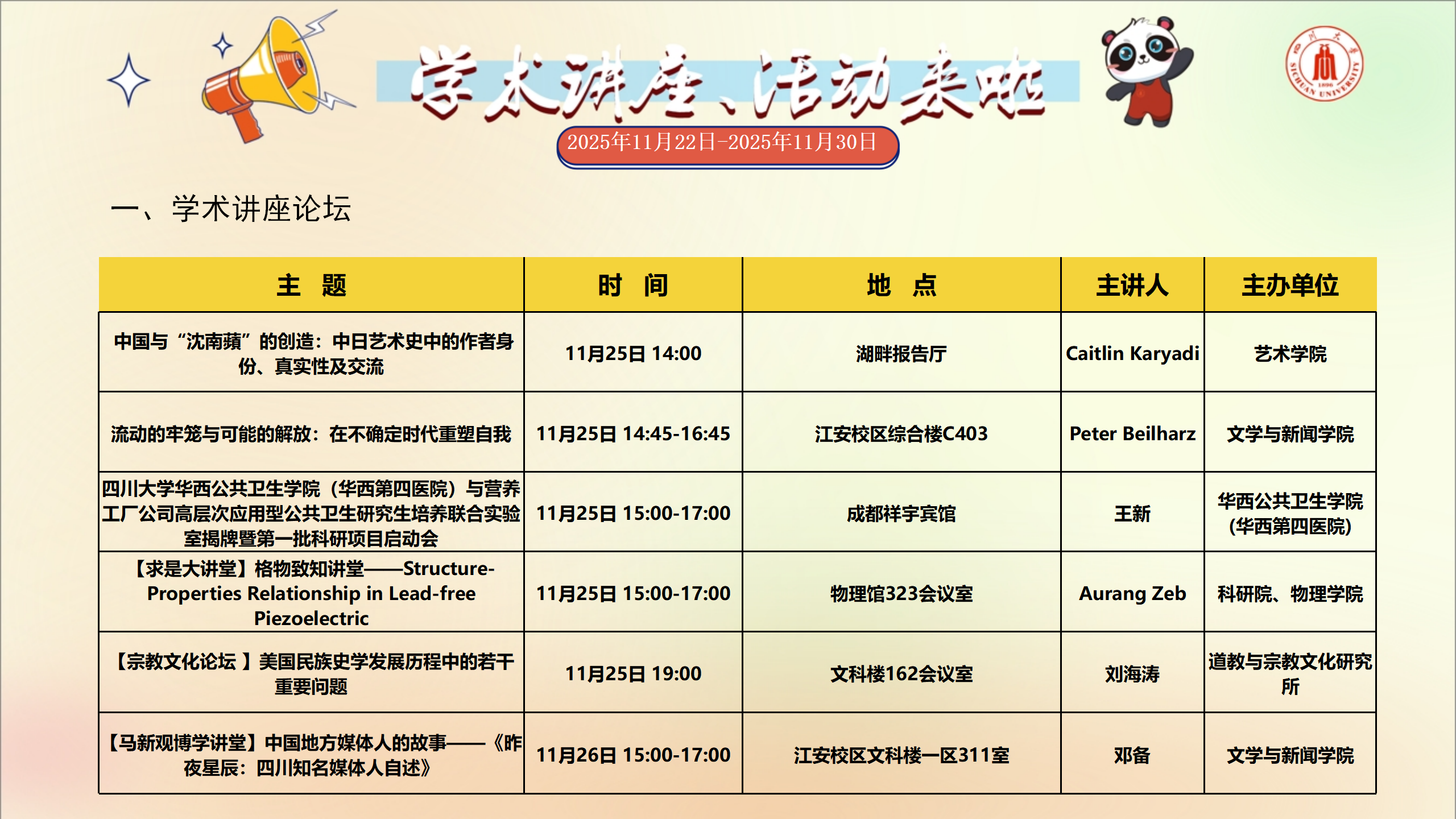 学术讲座和校园文化活动预告(2025年11月22日-2025年11月30日)