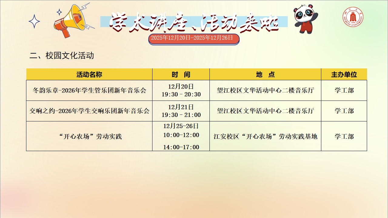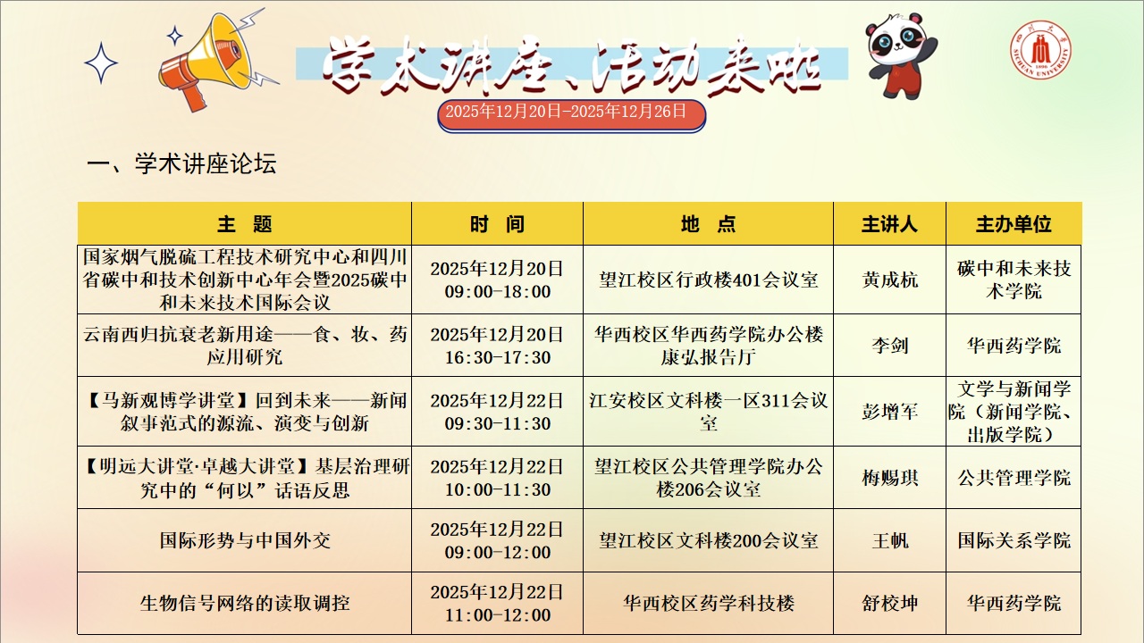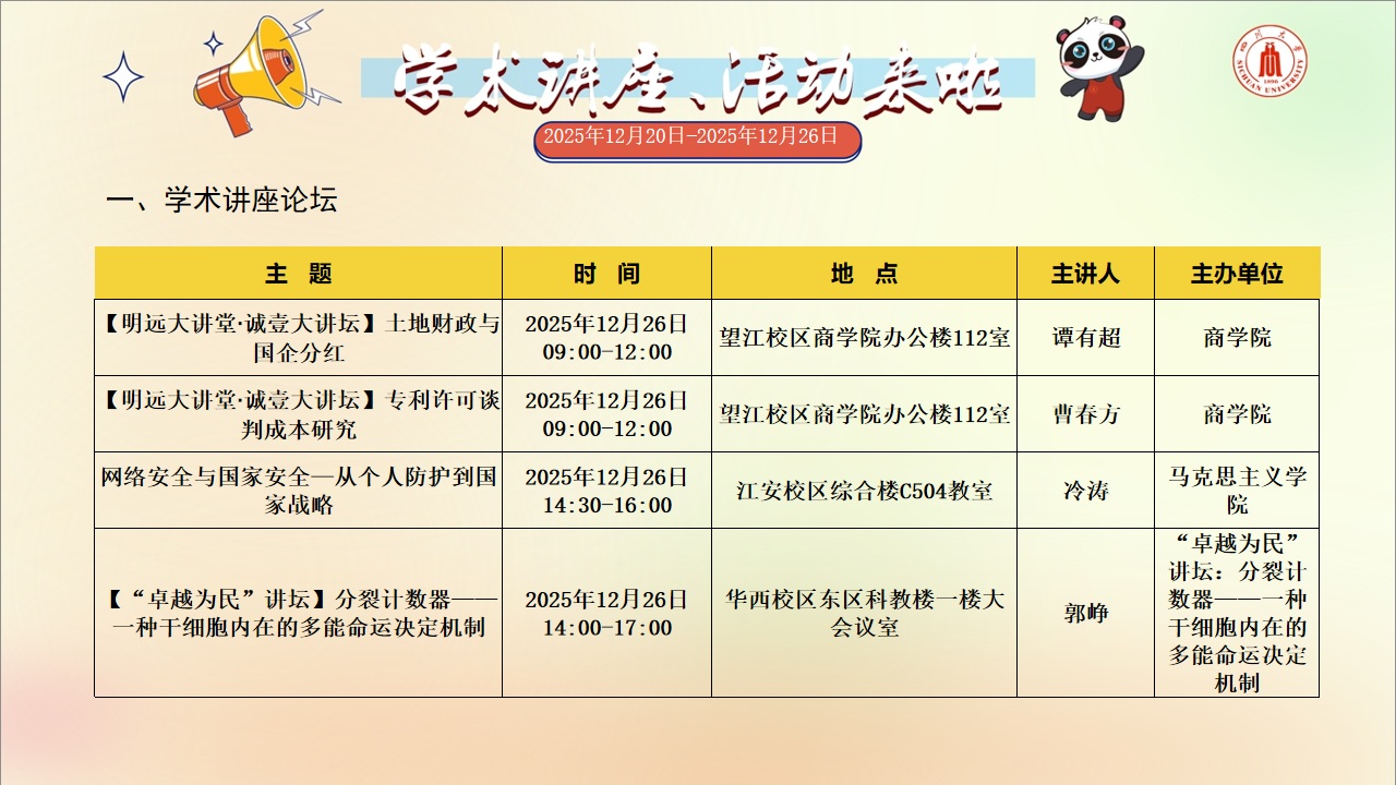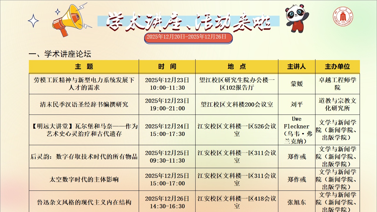 学术讲座和校园文化活动预告(2025年12月20日-2025年12月26日)
