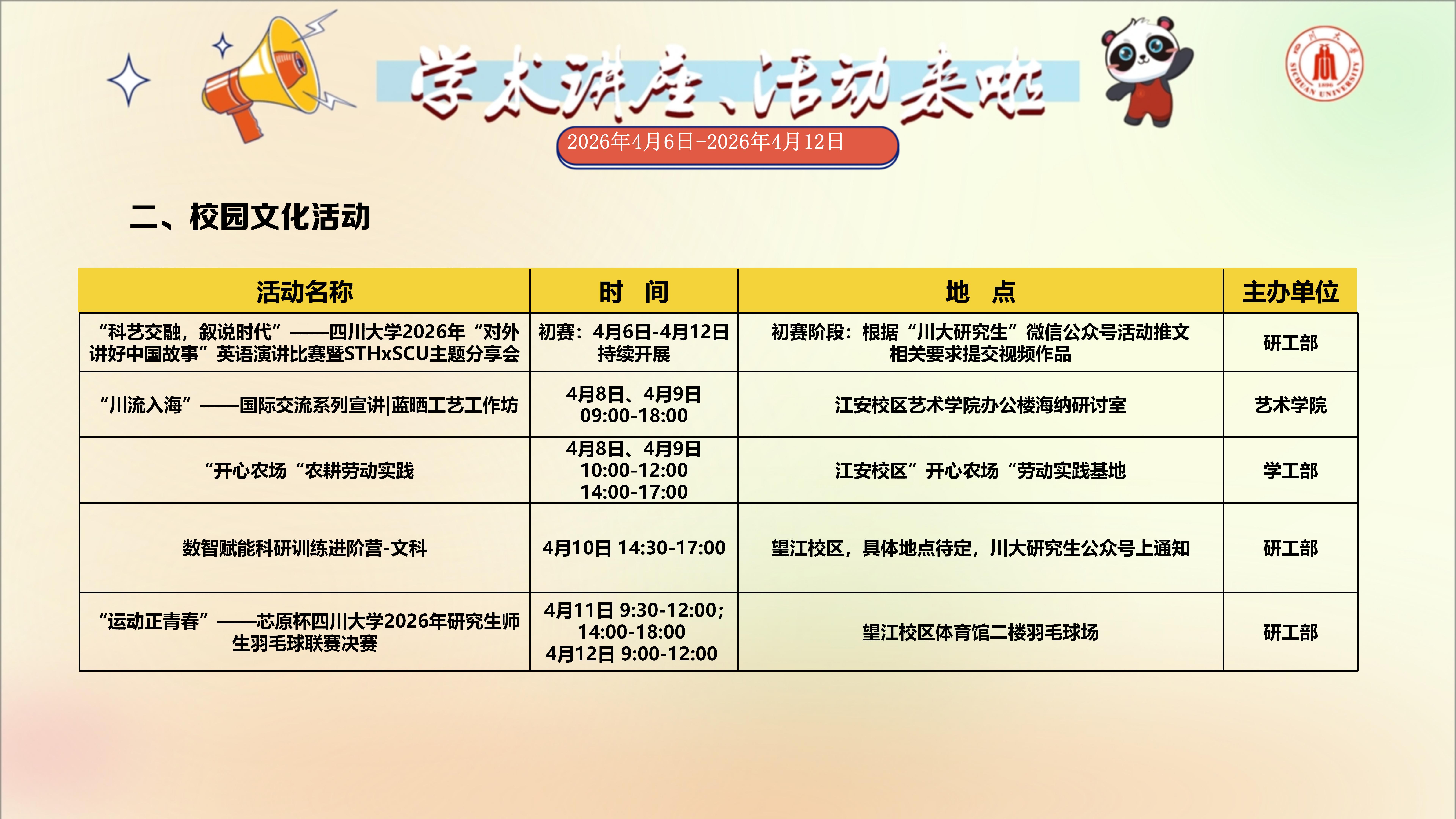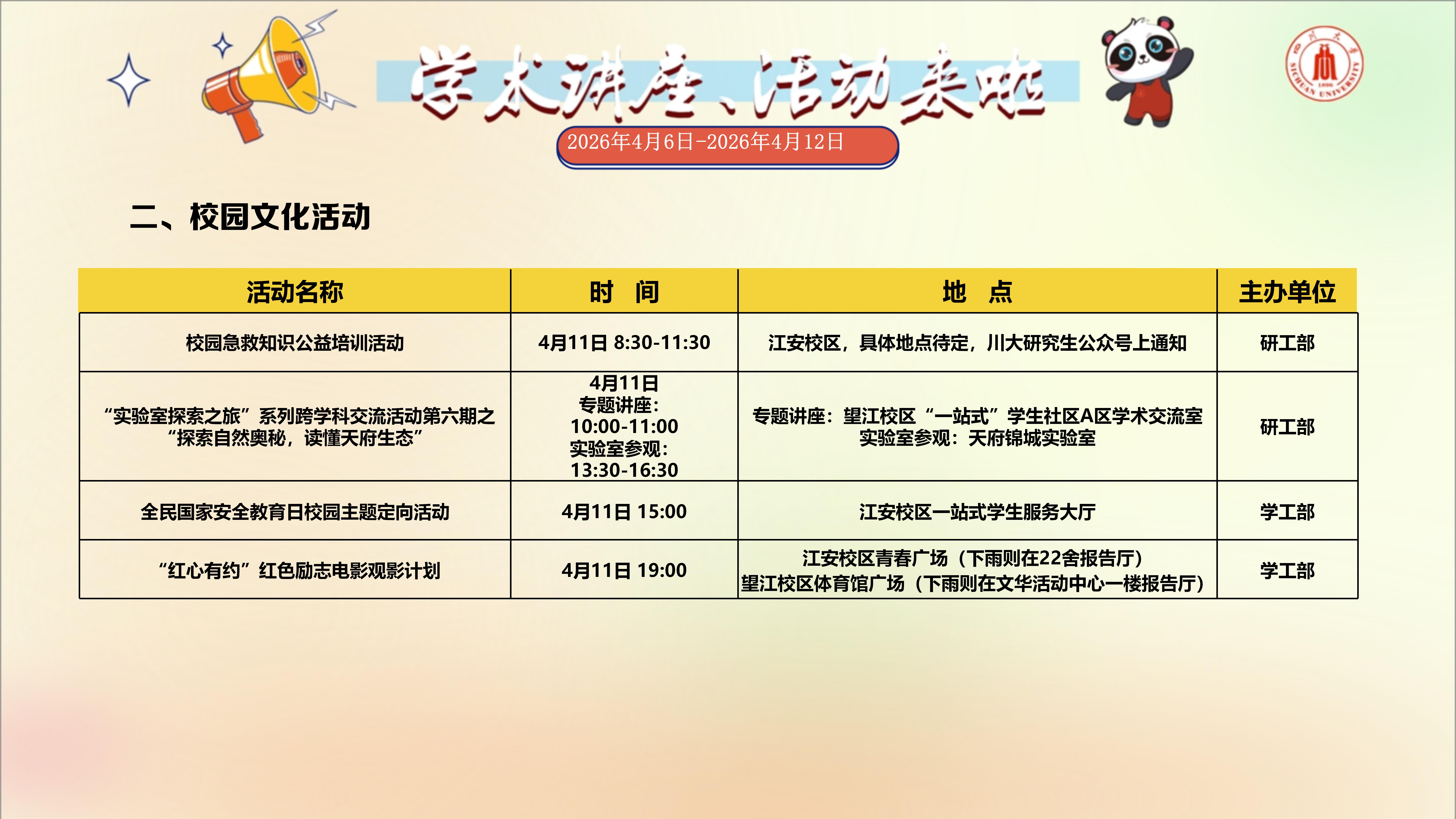 学术讲座与校园文化活动预告(2026年4月6日-2026年4月12日)